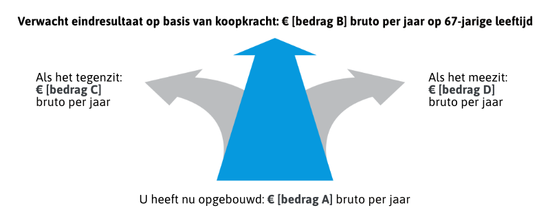 Het bedrag bij de bovenste pijl in het midden (bedrag B) is het verwachte eindresultaat. In de praktijk zal uw pensioen ergens tussen de bedragen aan de linker- en rechterkant uitkomen. Wat uw pensioen uiteindelijk wordt, hangt af van hoe de economie zich ontwikkelt. Gaat het heel slecht met de economie en stijgen de prijzen juist fors? Dan kan uw pensioen uitkomen op het linker bedrag (bedrag C). En als het juist beter gaat met de economie, dan kan uw pensioen uitkomen op het rechter bedrag (bedrag D). Er is een hele kleine kans dat uw pensioen nog iets lager of hoger uitkomt dan de bedragen die u hier ziet.